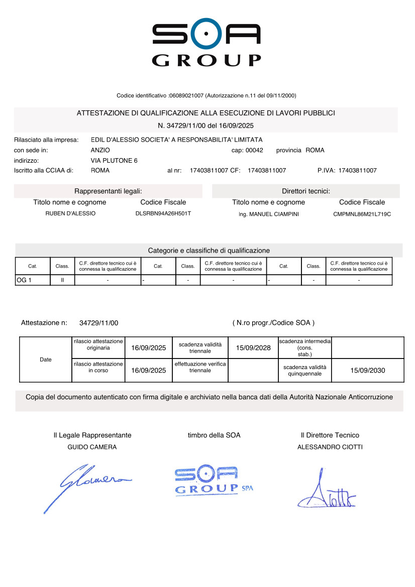 Grazie a una solida esperienza maturata sul campo e a una qualificazione tecnica in continua evoluzione, ci proponiamo come partner affidabile per ogni tipologia di intervento, con soluzioni su misura e attenzione al dettaglio, e al possesso dell’attestato di qualificazione SOA OG1 II categoria.